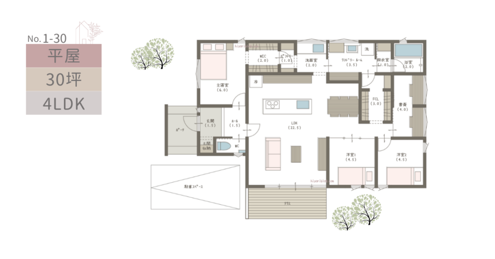 平屋×4LDK×30坪|籠もれる書斎のある平屋の間取り|No.1-30