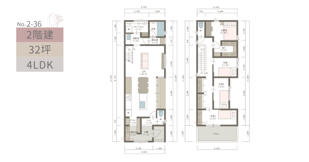 2階建×4LDK×30坪|スペースを効率良く活用!廊下のない総二階の間取り|No.2-11